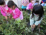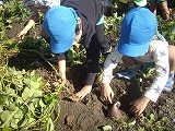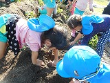 年少もも組は幼稚園の畑で芋ほりをしました。初めての経験で「どんなことするんだろう?」「やってみたい」とそれぞれの思いで芋ほりに参加しました。