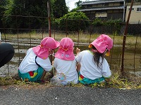 散歩の途中で出会った地域の方が追いかけてきてくださり、幼稚園の子ども達に…とメダカをくださり、大喜びの子ども達でした。これから大切に育てていきます。あたたかい地域の方々との関わりや豊かな自然の中で、普賢寺幼稚園の子ども達は健やかに大きくなっています。これからも、この地域の良さを存分に活かして保育をしていきたいと考えています。
