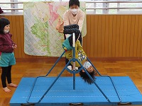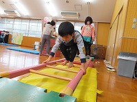 てくてくチャレンジの予定でしたが、あいにくの雨になったため、ホールで巧技台遊びをしました。室内大型遊具(ネット・すべりだい)やトランポリン、鉄棒、平均台…など、挑戦して楽しみました。