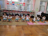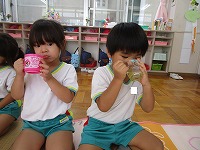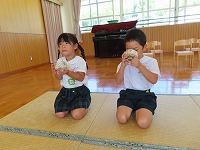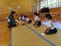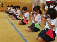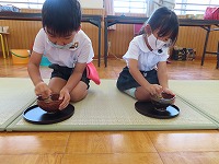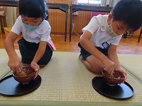 お茶会 今日は、幼稚園でお茶会がありました。5歳児は、6月に陶芸教室で作った自分のお茶碗を使い、焼き上がりを満足そうにながめながら、自分でお茶を点てました。4歳児は、初めてお茶の席に参加し、5歳児の様子を見学した後、お茶をいただきました。初めて体験した子もいたようで、ふくさ、扇子などのお茶の小道具を見て興味深々でした。お茶の先生から、「上手にご挨拶できますね」「姿勢がきれいですね」とほめていただきました。3歳児は、「お茶をいただきます」「お菓子を頂戴します」など、少しお茶会の作法をまねっこをし楽しみました。 京田辺市は、玉露の町。京田辺市のお茶を味わうことができました。そして、先生からは先日の中秋の名月にちなんで月やうさぎの描いてあるお茶碗のことも教えていただきました。これからも、日本の伝統文化や節目の季節を大切にすることを、子ども達に伝えていきたいと思います。