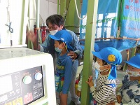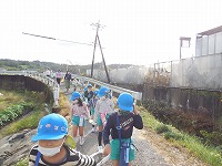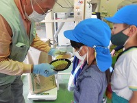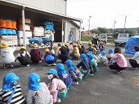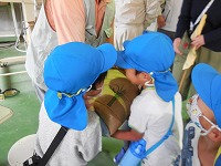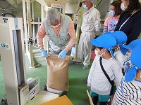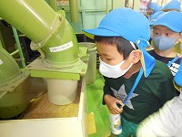 ライスセンター見学  5歳児が5年生と一緒に、地域のライスセンターを見学に行きました。乾燥、籾摺りを大きな機械で作業し、脱穀した米を玄米にする場所です。「機械からお米がいっぱい出てくる」「いいお米と悪いお米をセンサーでわけるんやって」と、地域の方に教えていただきながら楽しく見学することができました。1袋30Kgのお米を3人で持ち上げる体験では、「重い」「持たれへん!」と、お米の重さを実感したようです。今年も地域の方々の温かいご協力のもと、籾まきから、田植え、稲刈り、脱穀、籾摺りなど、一連の稲の成長過程を体験することができました。子ども達は、普段食べているご飯が、いろんな工程を経てできていることがわかったのではないかと思います。