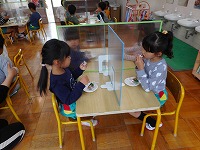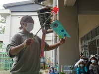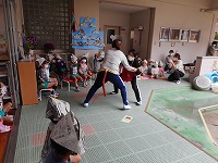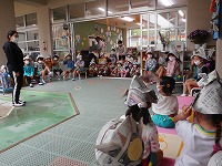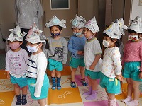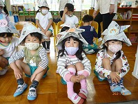 こどもの日の集い 5月5日はこどもの日。一足早く、こどもの日の集いでお祝いをしました。4,5歳児は自分でつくった兜をかぶり、3歳児は5歳児にプレゼントしてもらった兜に自分のマークを描いたものをかぶり、会に参加しました。こどもの日の由来を聞いたり、なぜ兜やこいのぼりを飾るのかなという話には、「鎧は悪いことから身を守るんやな」と、子ども達は興味をもって話を聞いていました。担任の「金太郎」の寸劇では、「おもしろかったな」と楽しく見ることができました。これからも季節の節目の伝統行事を大切にしていきたいと思います。 クラスでは元気いっぱい大きくなりますようにと、柏餅を食べ楽しく過ごすことができました。   |