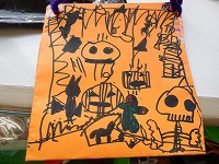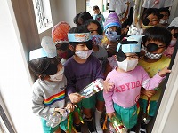 ハロウィンパーティーをしました 10月31日はハロウィンです。幼稚園で一足早く、ハロウィンパーティーをしました。今日まで「どうやって驚かせようかな」「お化けかな」と楽しみにしてきました。自分たちで衣装を作ったり、袋を作ったりしました。