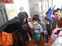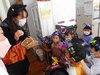 職員室から音楽が聞こえてきて「どこかな?」「どこかな?」と探しました。「happy halloween!」と魔女に扮した園長先生が突然現れて・・・。子ども達は、「トリック オア トリート!」「おかしをくれなきゃ いたずらするぞ」と言って一人一人かぼちゃクッキーをもらいました。