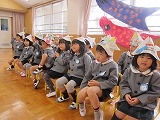 もも組(3歳児)さんは、すみれ組(5歳児)さんに作ってもらった”かぶと”をプレゼントしてもらい、ニコニコ笑顔に^^