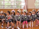 自分たちで作った”かぶと”をかぶって、子どもの日の集いに参加しました。