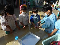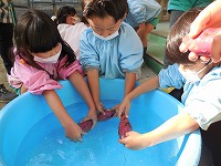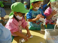 朝、登園するとすぐに芋をきれいに洗って、キッチンペーパー、アルミホイルに包みました。年長すみれ組に教えてもらって、年少もも組も見ながら包むことができましたよ。