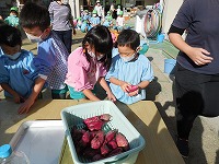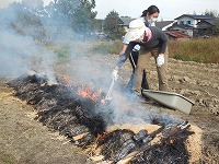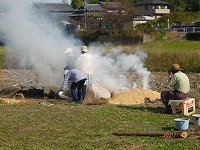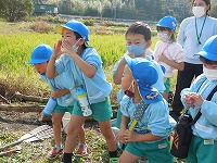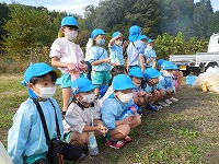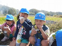 芋畑に着くと、大冨さんに挨拶をして、もみ殻、松ぼっくり、わら、たきぎ、落ち葉を焼いた所に、芋を入れました。「おいしくなーれ」「すごい煙!」「早く食べたいな」と出来上がりを楽しみにしていました。