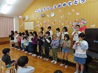 リコーダーで「エーデルワイス」と「にじ」の歌を聞かせてもらいました。力強くてきれいな歌声に、うっとりしながら、「あんな風に歌えるようになりたいね」と話していました。一緒に「にじ」の歌を手話で歌い、あたたかい雰囲気に包まれました。