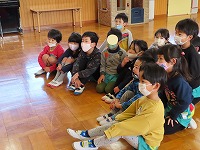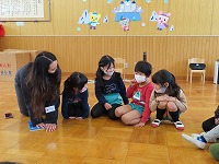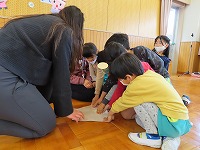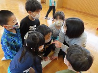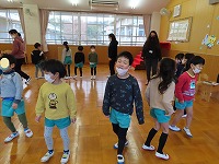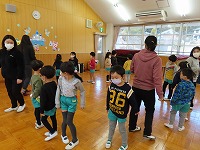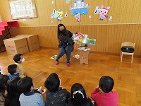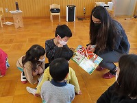 英語で遊ぼう  今日は、国際交流員のリア先生が幼稚園に来てくださいました。「はらぺこあおむし」の絵本を英語で読んでいただき、興味深く聞くことができました。また、動物カードを使って動物の名前や鳴き声を英語で教えていただき、「牛はCOW!」「鳴き声は、モーじゃなくてムー!?おもしろい!」と、楽しみました。リア先生と英語の曲に合わせて踊ったり歌ったりして、英語に親しむ楽しい機会となりました。