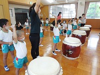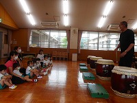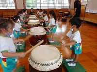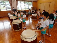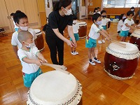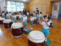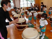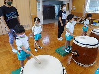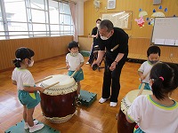 今日は、幼稚園に豊岡こうのとり太鼓の皆さんがきてくださいました。ホールに入るなり、大きな太鼓をみた子ども達は、「わあ すごい」と声をあげていました。最初は、太鼓の先生から「太鼓は、どれくらい昔からあるでしょうか?」「太鼓の上のところは、何でできているでしょうか」などのクイズを出していただき、子ども達は、興味深く答えていました。最初は、大きな太鼓を叩くことが、難しそうでしたが、一人ずつばちを持って、先生の掛け声に合わせて太鼓を叩くうちに、だんだんとみんなで音を揃えて叩くことができるようになり、みんなで「ヤッ」「ドンドン わっしょい」と、掛け声をかけながら、音を合わせて演奏を楽しむことができました。最後は、豊岡こうのとり太鼓の皆さんの演奏を聞かせていただきました。大迫力の音に、子ども達はひきつけられ、真剣なまなざしでみていました。普段から遊びで太鼓や楽器遊びに親しんでいた子ども達は、本物の太鼓や演奏に出会うことができ、興味をもって体験することができました。これからも、子ども達の心に響く体験ができるようにしていきたいと思います。