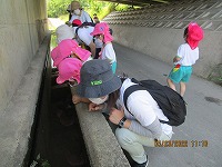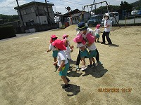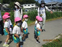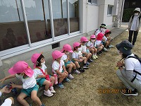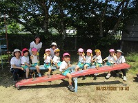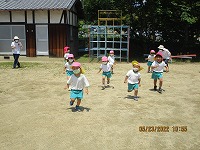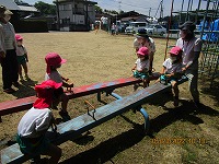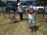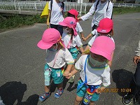 よいお天気に恵まれ、3歳児が近くの公園に遠足に行きました。行く道では、「きれいなお花咲いているね」「ちょうちょうも飛んでるね」と、楽しく景色をみながら歩きました。公園では、シーソーに乗ったり、ジャングルジムで遊んだりし、広場ではみんなで「よーいどんしよう」と、元気いっぱい走って遊びました。お弁当は、幼稚園に帰ってから「おにぎりおいしい」「おやつももってきたよ」「遠足楽しかったね」と、楽しく食べました。先生と友達とちょっぴり冒険した気持ちで遠足に行くことができました。