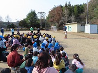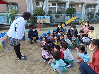 合同避難訓練 地震を想定した避難訓練を普賢寺小学校と合同で行いました。 大地震が来た想定で、一度幼稚園の園庭に集まり、いつも通っている小学校とのアーチからではなく、グランドまで歩いて避難しました。小学校の先生から地震の話、防災の話を聞きましたが、真剣に聞いていました。