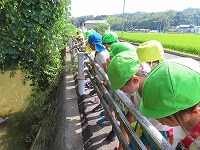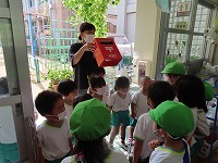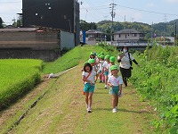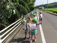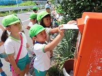 年長すみれ組と年中たんぽぽ組が手をつないでポストまで歩きました。普賢寺の自然に触れ、地域の方がみなさんが声を掛けてくださり、温かさを感じました。農作業の手を止めて声を掛けてくださったり、子ども達が安全に通れるよう草を刈ってくださったり…地域の方々に見守っていただいています。近くの茶葉販売店からお茶の香ばしい香りがしたり、草花のにおいがしたり、風が心地よかったり…と、本当に素敵な地域だなと感じながら歩きました。