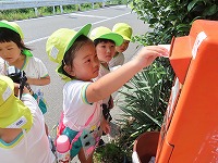 9月19日は敬老の日です。おじいちゃん・おばあちゃんに手紙をかき、今日ポストに投函しました。年少もも組は「お願いします」と年長すみれ組にハガキを持って行ってもらいました。