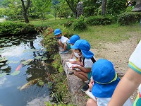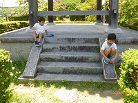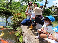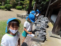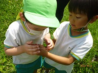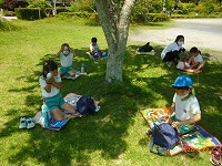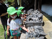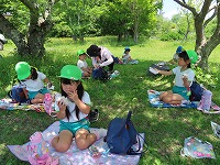 4,5歳児は、地域のお寺「大御堂」に「てくてくチャレンジ遠足」に行きました。気持ち良い風が吹き、周りの景色を楽しみながら歩きました。到着して集合写真を撮影した後は、5歳児はお寺にある鬼瓦や蓮の花をスケッチしました。「鬼瓦は大きな口が開いているわ」「蓮の花きれいね」と、よく見て描くことができました。4歳児は、シロツメクサやヒメジョオンなど、春の草花がたくさん咲いている広場で花を摘んだり、鬼ごっこをして遊びました。お弁当は、木陰でシートを広げ、「どんなおにぎり?」「何個持ってきた?」など、友達と一緒に楽しく食べました。