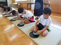 お茶会 待ちに待ったお茶会でした。年長すみれ組は自分で点てていただくご自服の2回目。久しぶりのお茶会だったのに、よく覚えていてびっくりしました。「前回よりも上手になりましたね」と先生からも褒めてもらい、おいしくお茶を点てることができました。