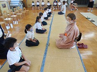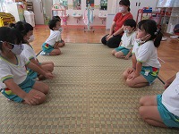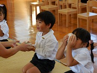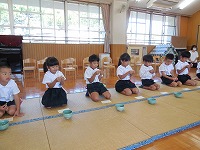 初めてホールに上がって、お茶会を経験した年中たんぽぽ組。ちょっぴり緊張しながらも、先生の話を聞いてすることができました。