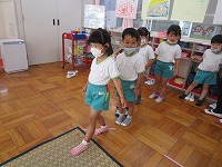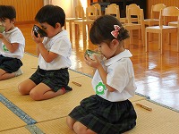 年少もも組は保育室でお茶会ごっこをしました。お作法を教えてもらい、緑茶をいただきました。