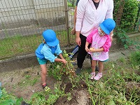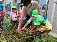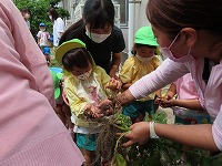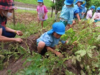 じゃがいもがいっぱいとれたよ 3月に植えたじゃがいもが収穫の時期を迎え、今日収穫しました。毎日水やりをし、お世話をしてきました。「葉っぱが枯れてきた」「じゃがいも、ちょっと見えてる」と気付きがあった子ども達…「じゃがいも掘ろうか?」と言うと「やったー」と大喜びの子ども達でした。 「見てー」「いっぱい出てきた」「大きいよ」「これ小さいじゃがいも!」など口々に話しながら収穫を喜びました。