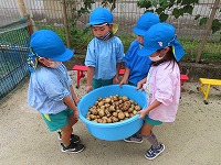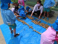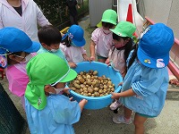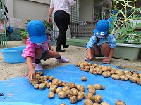 たくさん収穫できました。「よいしょ!よいしょ!」と力を合わせて運び、並べて大きさ分けをし、数を数えました。「いっぱいとれたね」「カレー食べたいな」と話していました。