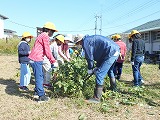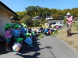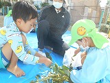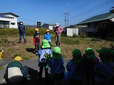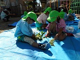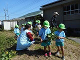 4歳児たんぽぽ組の園児と普賢寺小学校の4年生と一緒に枝豆の収穫をしました。