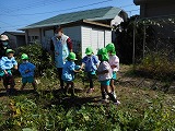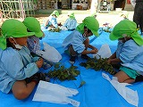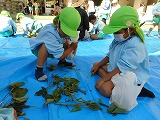 担任の先生から、「二人で仲良く分けて袋に入れてね。」と言われると、二人で全部もぎ取ってから数を数えて袋に入れている子、一つずつもぎ取りながら袋に入れている子、数が同じにならなくて、どうしようかと友達と悩んでいる子など、いろいろな姿が見られましたが、4歳児なりに考え、解決しようとする姿がとても微笑ましかったです。