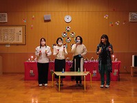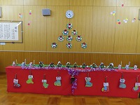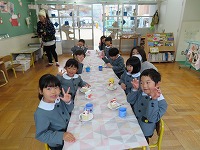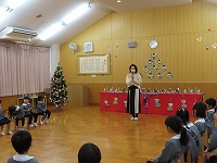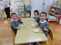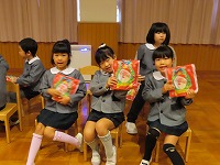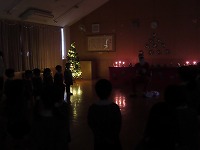 クリスマス会 みんなが楽しみにしていたクリスマス会をしました。ろうそくに火をともして、幻想的な雰囲気の中、園長先生からクリスマスの話を聞いたり、みんなでクリスマスソングを歌ったり、ハンドベルの演奏を聴いたりしました。♪シャンシャンシャンシャンとどこからか鈴の音がして、サンタクロースが来てくれました。「メリークリスマス☆」と登場してくれたサンタさんに大喜び!プレゼントをもらい、ニコニコ笑顔でした。保育室でケーキをみんなで食べ、夢いっぱいの一日でした。