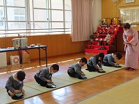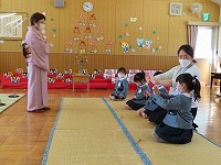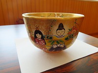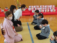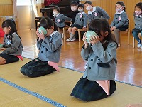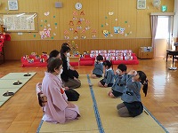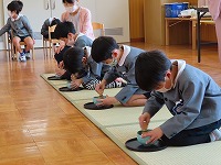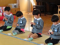 ひなまつりお茶会  今日は、3月3日ひなまつり。自分たちが作ったお雛様や段飾りを見ながら、ひな祭りの由来を聞いたり、「うれしいひなまつり」の歌を歌ったりしました。そして、今日は、ひな人形を前にお茶会をしました。5歳児は、自分で茶筅でお茶を点て、お作法を思い出しながら心静かにお茶会を楽しみました。今年3回目のお茶会なので、菓子盆を隣に回すのも、お辞儀の仕方も丁寧にすることができました。「お茶おいしいな」「お菓子も2つもある」と、嬉しそうでした。3歳児も、初めてのお茶会でした。「お菓子おいしい」「お茶苦いけど飲めるよ」と、落ち着いて参加できました。お茶の先生に「初めてなのに上手ですね」とほめていただき嬉しそうでした。お茶どころの京都。日本文化を知り、身近に感じてくれたらと思います。