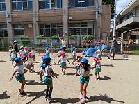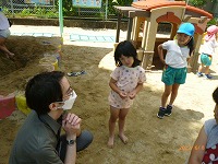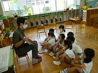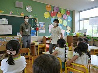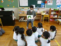 英語で遊ぼう 今日は幼稚園にALTの先生がきてくださり、英語に触れて遊びました。朝はドキドキしながらも「Good morning!!」と元気よく挨拶を交わすことができました。園庭ではALTの先生と体操をしたり、砂場遊びをしながら、英語で話してみようとチャレンジする子もみられました。4歳児のたんぽぽ組では、先生の自己紹介や英語の絵本や手遊びなど教えていただき、英語で楽しく遊ぶことができました。今後も、異文化の触れ合いから楽しさを感じ、子ども達の興味関心を広げていきたいと思います。    |
