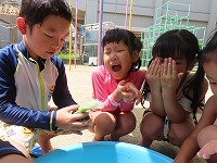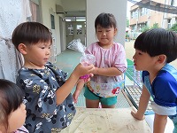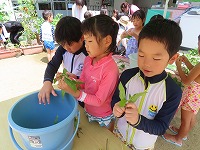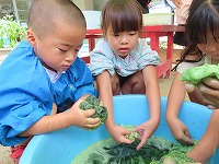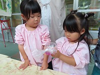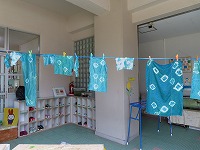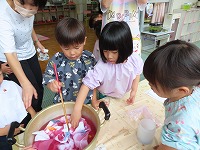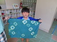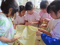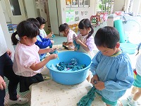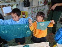 今日は、身近にある草花や幼稚園で育てている藍を使って、木綿、絹の布を染めて遊びました。模様をつけるために、布を洗濯ばさみではさんだり、輪ゴムでくくったり、ビー玉をしばったりしました。