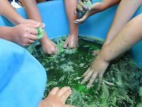 藍の生葉をちぎって細かくし、ギュっとしぼって、緑の染め液を作りました。輪ゴムや洗濯ばさみでしばった布を液に浸し、しばらくして輪ゴムや洗濯ばさみを外すと…「みてみて!」「きれい!こんな模様ができた」「花火みたい」「緑の液なのに、青っぽくなった!」とできた模様を見て喜んでいました。