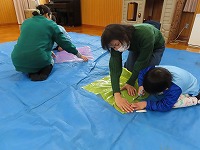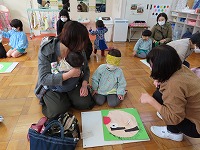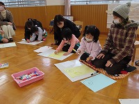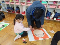 3歳児は、福笑いを作りました。先日のこども新年会で初めて福笑いのことを知った子もいたようで、参観で作ることを楽しみにしていました。「どんな目にする?」「かっこいい眉毛できたね」と、思い思いの顔の部分を作りました。出来上がった福笑いで、目隠しをして挑戦しました。「あれ、変なところに目があるよ」「おもしろい顔になっちゃった」「次はお父さんしてみて」と、親子で笑いながら楽しむことができました。