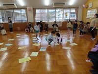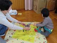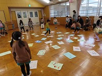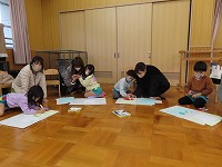 5歳児は、カルタづくり。50音の文字から2つ字を選び、読み札と取り札を作りました。絵はお家の方と「どうする?」「一緒に色を塗ろう」と考えながら描いたり、文字も教えてもらいながら頑張って書いたりしました。チーム対抗のカルタ大会では、読み札が読まれると「どこにある?」「あった!」「やったとれた!」と、真剣に探して盛り上がりました。