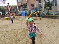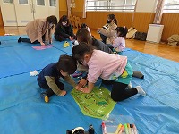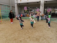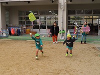 4歳児は、お家の方と協力して、はさみでビニールを凧の形にしたり、絵を書いたりシールを貼ったりして素敵な凧を作りました。「早く飛ばしたいな」と、できあがった子から園庭に出て飛ばすと「あがった!」「高く飛んだ」と、大喜びの子ども達。元気いっぱい繰り返し走って、風を受けた凧がよく飛んでいました。