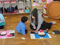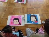 各クラス参観・懇談があり、お家の方と一緒にお正月遊びを楽しみました。3歳児もも組は福笑いを作って遊びました。できあがりを見て「わぁーこんな顔になった!」「へんな顔!」と笑い声が聞こえていました。