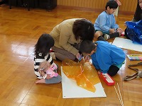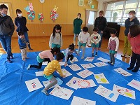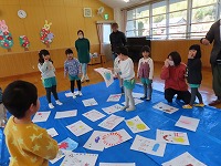 年長すみれ組はカルタを作って、カルタ取り大会をしました。お家の方と相談しながら読み札、取り札を作り、自分たちが作ったジャンボカルタでするカルタ取りは盛り上がりました。