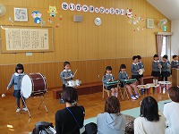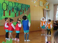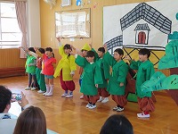 年長すみれ組は、いろんな楽器を使い友達とリズムを合わせて合奏しました。劇は、一人一人が台詞を言い、役になりきって演じることができました。