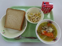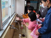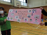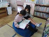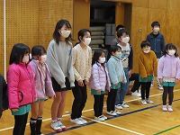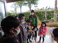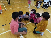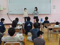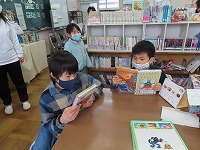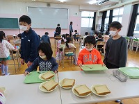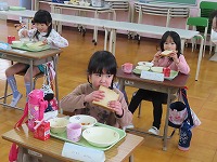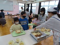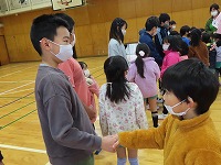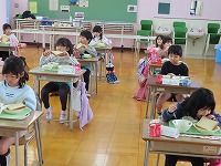 もうすぐ就学を迎える5歳児が小学校で給食体験をしました。田植え体験のもみまきから交流がある5年生に出迎えてもらい、うれしそうな5歳児でした。2回目の給食体験ということもあり、小学校での手洗いや配膳も5年生に見てもらいながら期待をもってすることができました。小学生の机に座り、学校の給食の雰囲気を味わいながら「黒糖パンおいしい」「コーン苦手やけど、頑張って食べてるよ」「おかわりしたい」と、旬の野菜が入ったおかずをパクパク食べる5歳児です。給食の後は、図書室で絵本を読んでもらったり、体育館でゲーム遊びやドッジボールをして楽しいひとときを過ごしました。最後には、今年一年、楽しく交流をしてくださった5年生にお礼の手紙を渡し握手をしてもらいました。優しいお兄さんお姉さんに出会えて、小学生になることを楽しみにしている5歳児です。