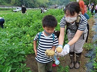ジャガイモたくさんとれたよ 普賢寺小学校、幼稚園には、「なのはな委員会」といって子ども達が普賢寺地域や普賢寺幼稚園のことを大好きになれるように、応援してくださっている地域の方々がたくさんおられます。ジャガイモの栽培も「なのはな委員会」の皆さんが考えてくださって、3月の植え付けから世話をしてくださり、収穫の時を迎えました。 土曜日でしたが、親子で畑にたくさんの方々が来てくれ、みんなで収穫を楽しみました。とても立派なジャガイモがいっぱい掘れました。例年にない程の大豊作!たくさんのジャガイモをお土産にもって帰りました。ありがとうございました。