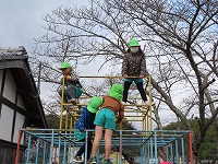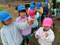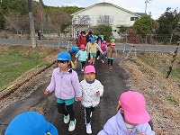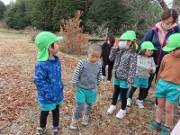 雨天が心配でしたが、雨のやみ間に近くの地域に散歩に出かけ、公園に行ってきました。今日は寒い日でしたが、道端には春の草花が咲き始め、梅のつぼみがほころんでいる様子がみられました。子ども達は、草花を摘んだり梅の花の香りをかいだりしていました。公園では、「シーソー一緒に乗ろう」「鬼ごっこしよう」と、異年齢の友達と元気に走ったり、遊具で遊んだりしました。季節の移り変わりを感じながら地域を歩き、楽しくてくてくチャレンジに行くことができました。