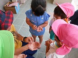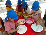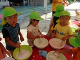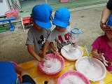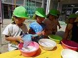 梅雨入りし、雨が続きましたが、今日やっと晴れました!「今日はお外で遊べるね」と朝から喜んで登園してくれました。今日は❝あわあわ屋さん❞がオープン!しました。一人1つの洗面器に魔法の粉(石鹸)を入れて、水を入れて、泡立て器でシャカシャカ☆お料理みたいで楽しんでいました。