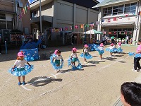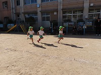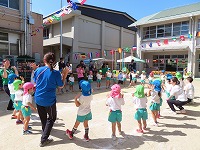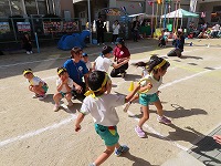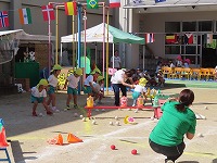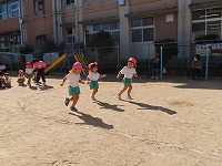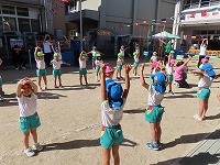 4歳児たんぽぽ組は、大好きな恐竜になってリズム表現をしました。それぞれの恐竜の特徴をかわいく表現できました。競技は「モンスターを倒せ!」でチームで力を合わせてコーンのモンスターを倒しました。