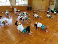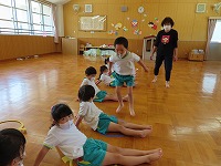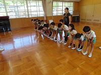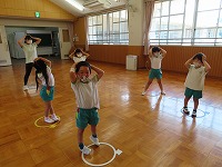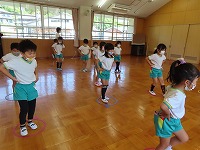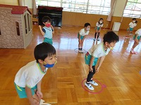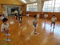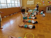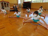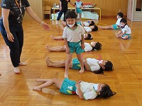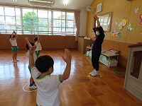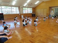 4,5歳児が、のびのびタイムに参加しました。元大学の先生にご指導していただき、足を伸ばしたりジャンプをしたりと、身体のいろいろなところを動かして遊びました。「まいごのまいごのこねこちゃん♪」など、歌いながら童謡の曲に合わせて、ダンスやストレッチをすることも楽しい様子です。リズミカルに身体を動かす体験を1年間楽しんでいきたいと思います。3歳児も、2学期から体験します。