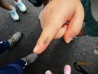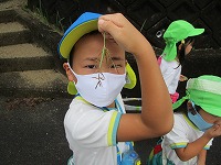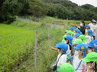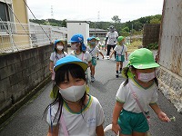 お散歩に行ってきました 朝夕は、涼しくなり秋めいてきました。4,5歳児の子ども達が 幼稚園の周りを散歩に行き「あ、柿がオレンジ色になっているよ」「どんぐりの赤ちゃん見つけた」と、まわりの自然の変化に気づきながら歩くことができました。自分たちで苗を植えた田んぼでは、「もうお米できてきてるんやな」と、生長の様子を興味深くみていました。10月に稲刈り体験をすることを楽しみにしています。 幼稚園は、普賢寺地域の豊かな自然に囲まれています。これからも散歩や収穫を通して秋の自然を感じながら過ごしていきたいと思います。  |