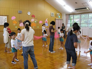 毎月来ていただいている先生と一緒に今日は、お母さん達も交えてのわらべうた遊びを楽しみました。
