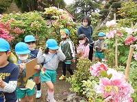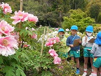 牡丹の花が綺麗でした 4月19日(月) 4、5歳児の子ども達が、心地よい春風の中、地域の方のご厚意で天王にある「無二荘牡丹園」に行ってきました。道中は、いろんな春の自然をみつけることができ、「ウグイスの鳴き声聞こえたよ」「桜の花びらきれい」「タンポポの笛っておもしろい」と、春を楽しみながら歩くことができました。牡丹園では、「八重桜が散り始めると、牡丹の花が見ごろになるんですよ。今日は、一番見ごろのいい時に来たね」と、教えていただき、素敵なお庭を散策させていただきました。5歳児は、「何枚も花びらが重なってるね」「赤、ピンク、白。いろんな色があって綺麗」と、牡丹の花をよく見てスケッチをしました。4歳児もいろんな色の大きな花を見て喜んでいました。 自然豊かな普賢寺幼稚園。これからも、地域の自然に出かけ、四季を感じたり、いろんな発見をしたりしていきたいと思います。