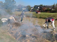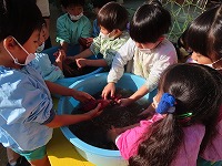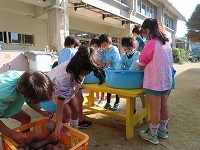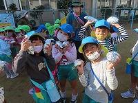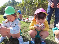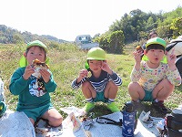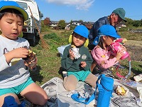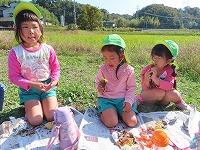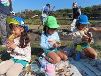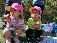 遊んでいると、焼き芋が出来上がりました。「もうできた?」「焼き芋大好き」と、楽しみにしていた子ども達。一口食べると、「熱い!ホカホカや」「すごいおいしい!」と、焼きたてホクホクの焼き芋を嬉しそうに食べていました。地域の皆様にご協力をいただき、おいしい焼き芋を味わうことができました。ありがとうございました。
