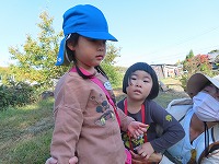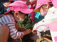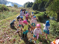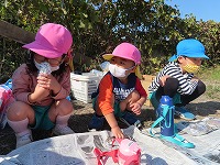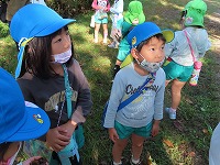 お天気に恵まれ、今日は、サツマイモを育て芋掘りをした畑で焼き芋パーティをしました。最初に幼稚園で「土がついてるから、きれいにしよう」「きれいに洗ったよ」とサツマイモを水でよく洗って、キッチンペーパーやアルミホイルで巻くお手伝いをしました。そして、「焼き芋楽しみやな」と、手にサツマイモをもって畑に行きました。焼き芋が出来上がるまでは、近くに散歩に行き、ドングリや紅葉した葉っぱを見つけて遊びました。