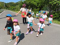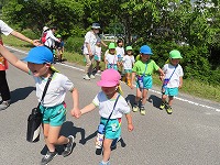 5月の爽やかな風を感じながら、サツマイモ畑まで歩いて行きました。年少もも組も初参加!みんなで自然の中を歩きました。